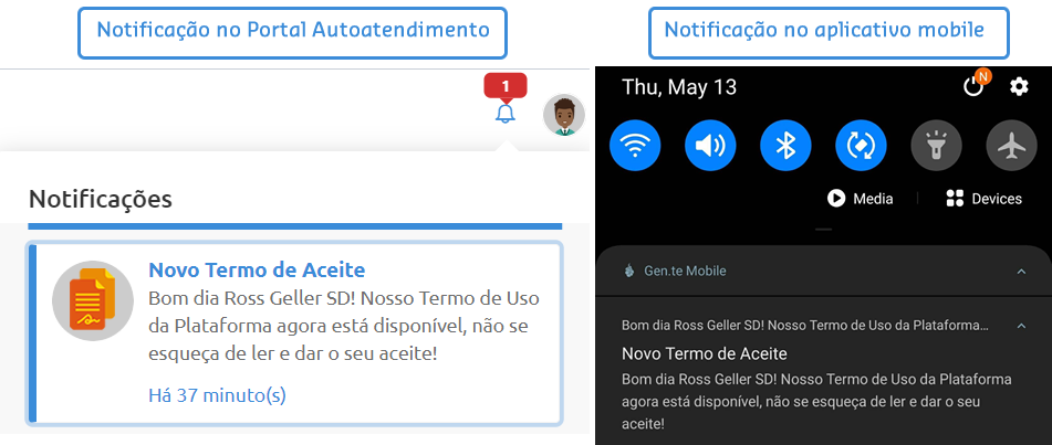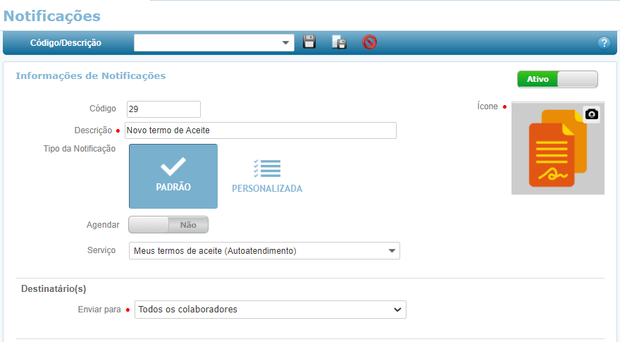 Um operador da Empresa X decidiu criar uma notificação para alertar seus colaboradores sobre um novo termo de aceite disponibilizado na plataforma. Foi cadastrada uma notificação do tipo Padrão com o serviço Meus termos de aceite (Autoatendimento) para que, ao clicar na notificação, o colaborador seja direcionado à funcionalidade Meus termos de aceite onde poderá visualizar e aceitar o termo.