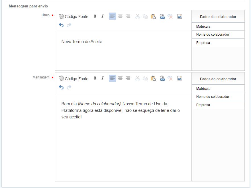 Em Mensagem para envio deve ser escrito o Título e o corpo da Mensagem, sendo possível adicionar tags que serão substituídas pela informação do colaborador que receberá a notificação. As tags disponíveis são: Matrícula, Nome do colaborador e Empresa.