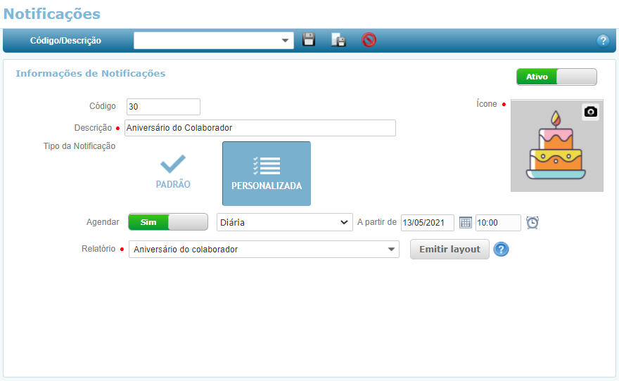 A Empresa Y fez a criação de uma notificação para mandar mensagens de aniversário aos seus colaboradores. Para evitar o trabalho de verificar manualmente os aniversariantes do dia foi criada uma notificação recorrente do tipo Personalizada baseada no relatório Aniversário do colaborador de acordo com a imagem abaixo: