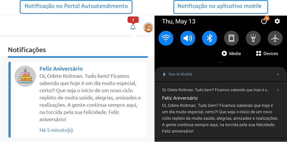Como a notificação foi criada com agendamento diário, todos os dias a partir da data apontada a notificação será executada no horário indicado e os colaboradores que fazem aniversário receberão uma mensagem no Portal Autoatendimento e aplicativo mobile: