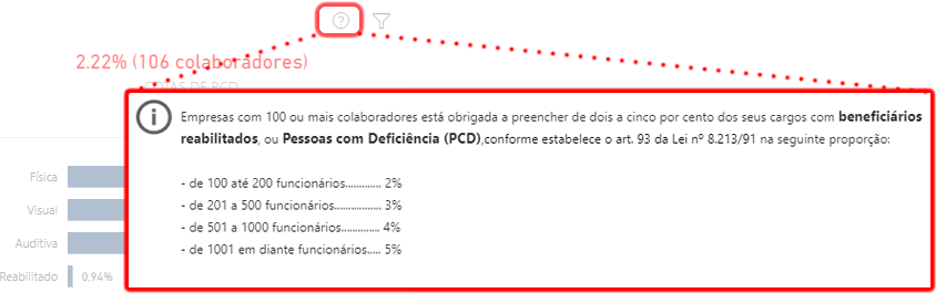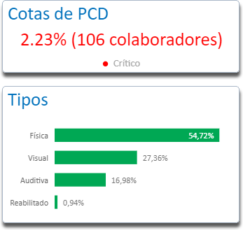 Por meio deste é possível verificar o percentual de colaboradores ativos considerados PCD, e a quantidade de colaboradores com PCD necessários para atingimento da cota estabelecida por lei, sendo possível identificar a quantidade que este percentual representa.
