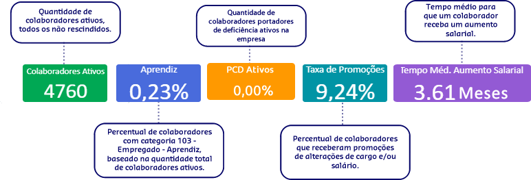 • Nos COLABORADORES ATIVOS são apresentados os números de colaboradores ativos conforme o Filtro utilizado. Para casos em que o Filtro se refere ao ano atual, os números apresentarão os colaboradores ativos no mês atual, já para o Filtro referente ao ano anterior serão exibidos apenas os colaboradores no último mês do ano.