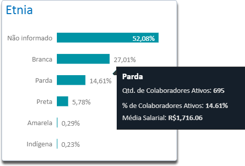 O gráfico permite a verificação do percentual de colaboradores ativos por Etnia.