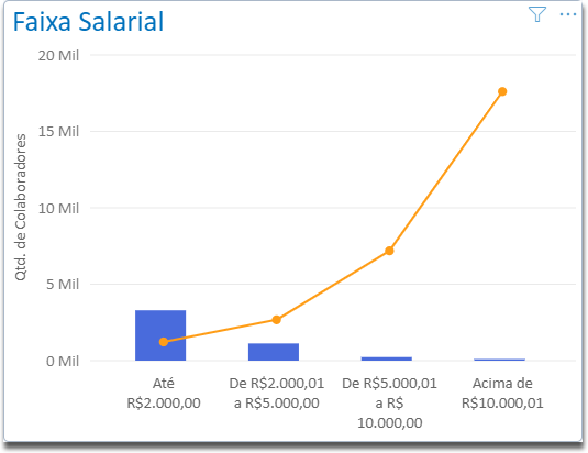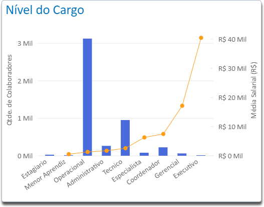 O gráfico permite a visualização da distribuição dos colaboradores pelos níveis do cargo, representado pelas barras azuis e a média salarial em cada um desses níveis, representado pela linha laranja.