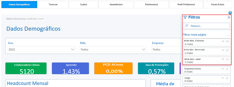 Na seção de Filtros, é possível realizar o filtro de acordo com as informações adicionais selecionadas na funcionalidade Configuração de cadastro corporativo, para as abas Dados Demográficos, Turnover, Absenteísmo, Performance, Perfil profissional e Horas extras.