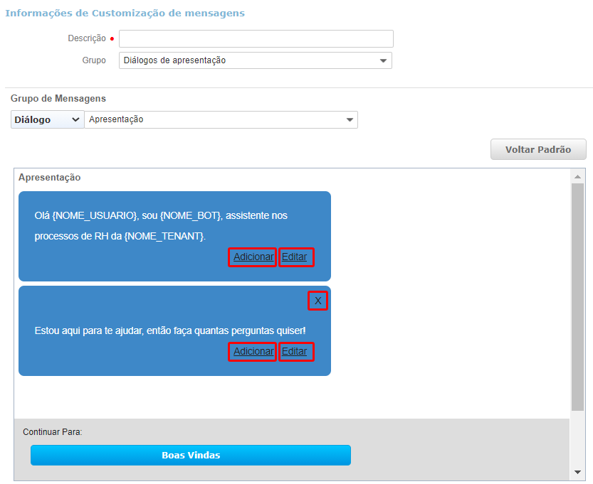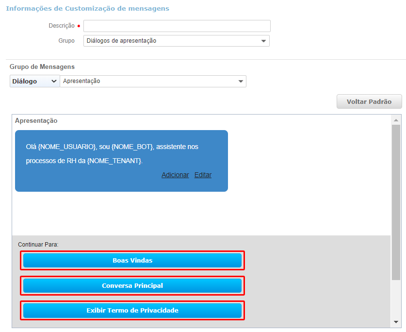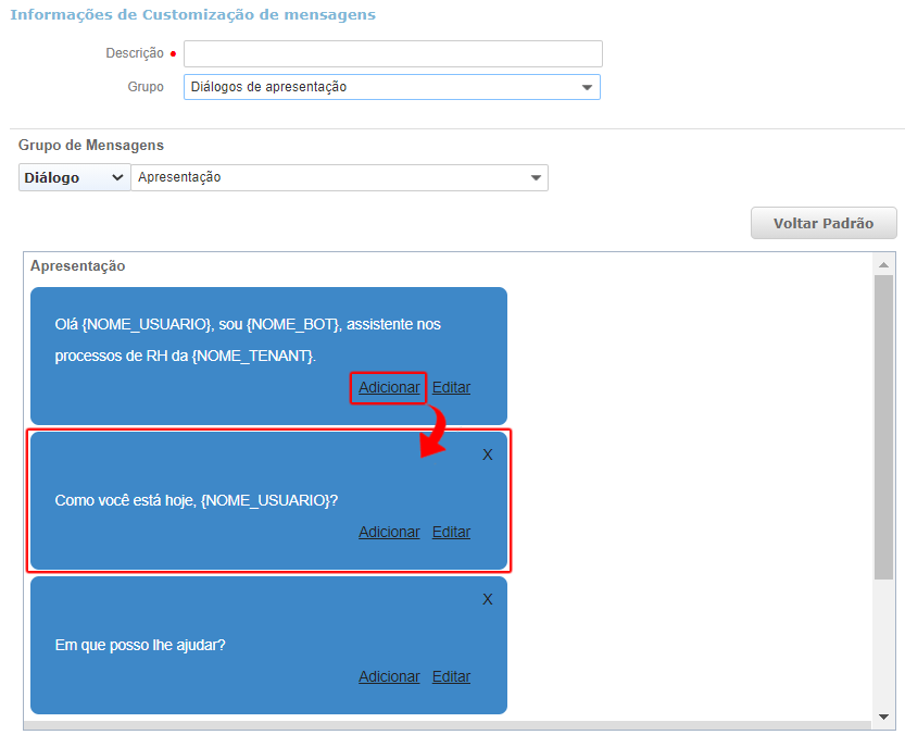 Um bot não poderá estar parametrizado em mais de uma Customização de Mensagens, contudo, caso deseje empregar um bot que já esteja parametrizado em outra customização, deve ser feita a retirada do bot da customização em que se encontra.