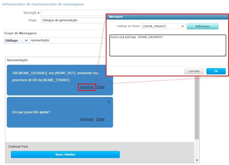 Caso queira acrescentar alguma Mensagem no Diálogo, clique no botão Adicionar da mensagem em azul, fazendo isso surgirá a janela Mensagem, nela informe como será a nova Mensagem do fluxo, preenchendo o campo com o texto e com o Catálogo de Tokens conforme julgar necessário. A tela Mensagem permite as formatações negrito, itálico, sublinhado e rasurado, assim como o uso de emojis.