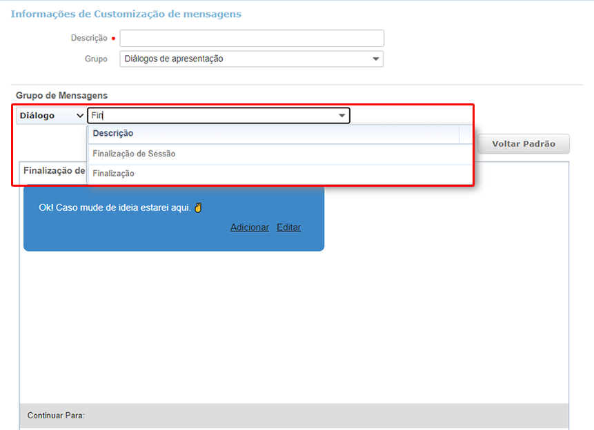 Em seguida escolha o Grupo que possui as mensagens que deseja customizar. As Mensagens e Diálogos apresentados na seção Grupo de Mensagens dependem do Grupo parametrizado, estando disponíveis os seguintes Grupos: