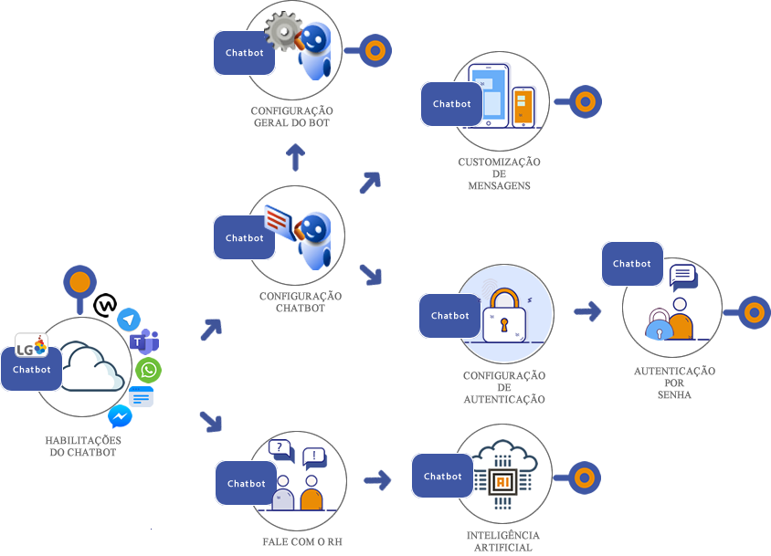 Habilitações do Bot Configuração Chatbot Configuração Geral do Bot Fale com o RH Customização de Mensagens Configuração de Autenticação Autenticação por senha Inteligência Artificial