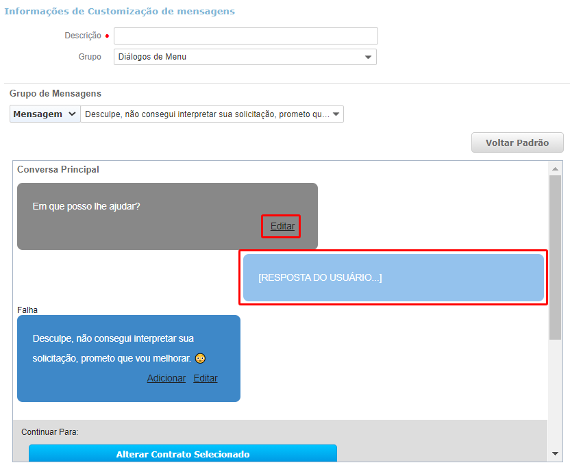 Na seção Grupo de Mensagens é possível customizar as mensagens emitidas pelo Chatbot, deixando-o mais personalizado, utilizando padrões de linguagem da empresa ou dos usuários que irão consumir os serviços. Para isso, selecione através do filtro o Diálogo ou Mensagem desejada para que seja exibida.