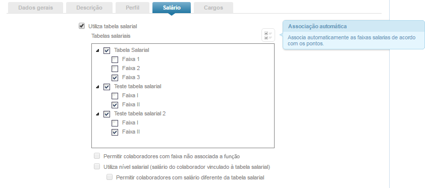 Indique se a função Utiliza tabela salarial, caso essa opção seja marcada, indique as Tabelas e Faixas salariais.