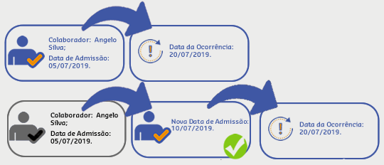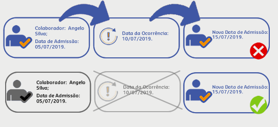 Caso a nova Data de Admissão seja uma data posterior à data atual, não poderá haver ocorrências que estejam anteriores ou iguais à nova data: