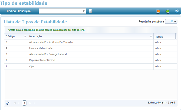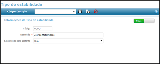 Existem diversas situações que podem gerar estabilidade para um colaborador, através dessa funcionalidade é possível cadastrar os tipos de estabilidade, que poderão ser utilizados nas funcionalidades Situação do Colaborador e Estabilidade.