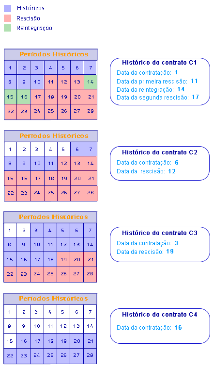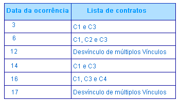 Mediante as datas identificadas através das operações de Contratação, Rescisão e Reintegração serão criados ocorrências de múltiplos vínculos com os respectivos contratos. Na rescisão os contratos não serão excluídos da ocorrência de múltiplos vínculos. Dessa forma, as ocorrências gerados para esse cenário ficará dessa forma: