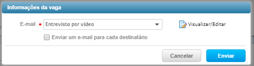 José dentro do processo seletivo optou por enviar o E-mail ja pré-cadastrado de forma Manual, ao tentar realizar o envio a seguinte tela foi exibida para que pudesse indicar qual e-mail será enviado: