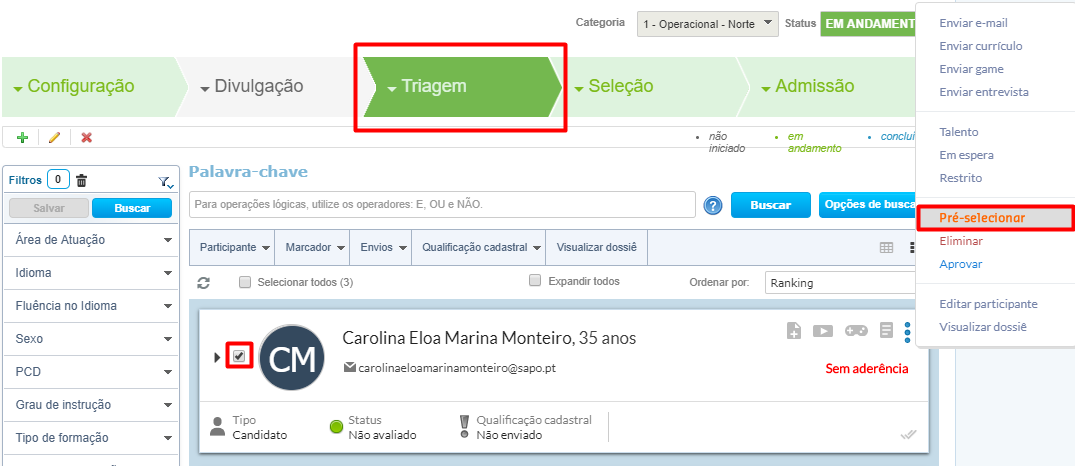 Após cadastrar o e-mail para essa Ação, a Empresa A realizou a pré-seleção de alguns candidatos na fase de Triagem no módulo Gen.te Atrai - Recrutamento e Seleção, ao fazer isso, permitiu que fosse realizado o disparado automático do e-mail conforme o template já cadastrado para Ação.