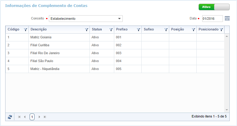 Na funcionalidade Complemento de Contas foi criado o Prefixo para ser o complemento que identifica cada estabelecimento.