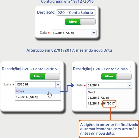 • Ao alterar algum dado da conta contábil e informar uma nova Data, inicia-se uma nova vigência e encerra o período anterior.