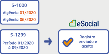 Foi realizado o envio do leiaute S-1000 nas vigências 01/2020 e a outra em 06/2020, em seguida foi realizado o envio e aceite do arquivo S-1299 - Fechamento dos Eventos Periódicos realizando o fechamento das referências até o mês 09/2020.