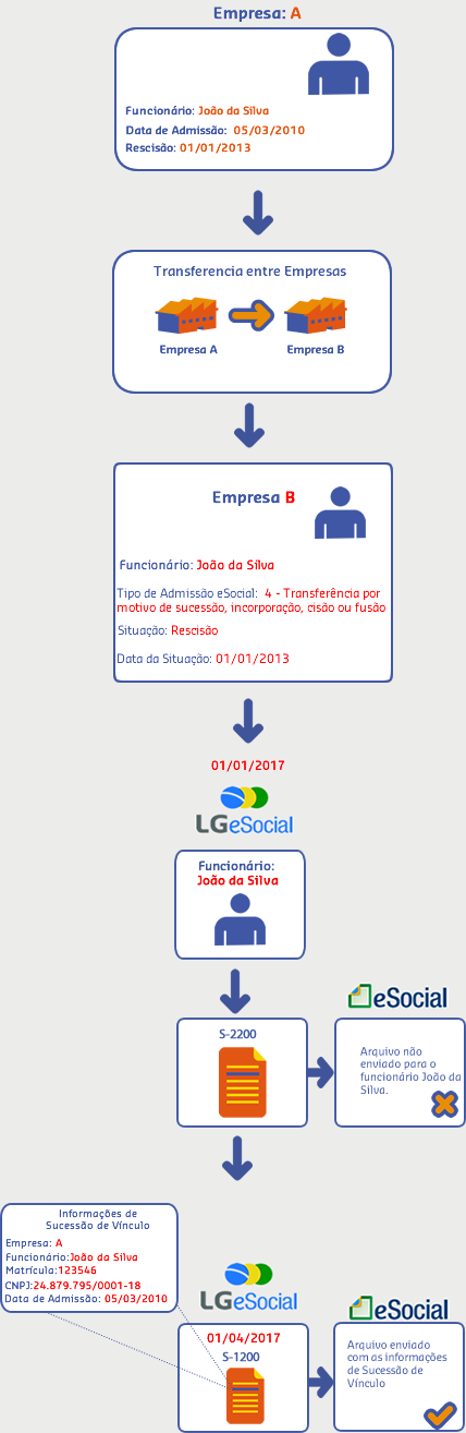 Considerando o cenário acima, observe que o arquivo S-2200 não foi enviado pela empresa sucessora e sua situação permaneceu como desligado. Além disso, o Tipo Admissão eSocial é igual a 4 - Transferência por motivo de sucessão, incorporação, cisão ou fusão. Sendo assim, as informações de sucessão serão enviadas no arquivo S-1200.