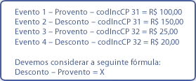 O somatório de cada uma das rubricas de Contribuição Previdenciária com códigos 31, 32, 34 e 35 , não pode ser negativo, ou seja, os proventos (que são devoluções da contribuição Previdenciária) devem ser inferiores aos descontos. Essa regra deve ser aplicada individualmente.