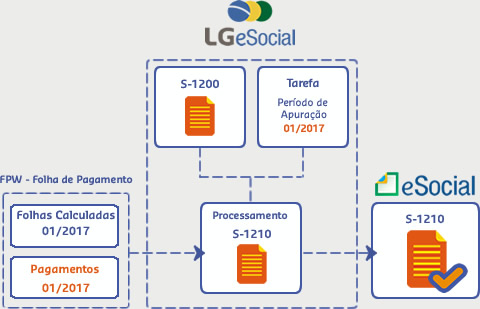 O processamento do arquivo S-1210 - Pagamentos de Rendimentos do Trabalho identifica as informações de pagamentos enviadas através dos arquivos S-1200 - Remuneração do Trabalhador, S-1202 - Remuneração de Servidor Vinculado a Regime Próprio de Previdência Social - RPPS, S-1207 - Benefícios - Entes Públicos, S-2299 - Desligamento, S-2399 - Trabalhador Sem Vínculo de Emprego/Estatutário – Término consolida e envia essas informações que estiverem dentro do Período de Apuração informado na tela Cadastro de Tarefa do Processamento, guia Folha de Pagamento, mesmo que esses pagamentos sejam referentes à competências anteriores ao período informado.