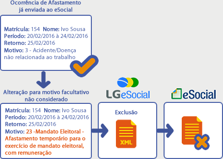 Após o cadastro e envio de um afastamento ao eSocial, o operador observou que informou erroneamente o motivo 3- Acidente/Doença não relacionada ao trabalho. Foi necessário alterar o motivo do afastamento para o correto 23- Mandato Eleitoral - Afastamento temporário para o exercício de mandato eleitoral, com remuneração, como o afastamento 23 é do tipo Facultativo (não obrigatório) conforme Tabela 18 - Afastamento Temporário, e não foi indicado para ser considerado (guia Regras de Envio, funcionalidade Configurações do Módulo), foi gerado um processamento de Exclusão ao eSocial deste afastamento: