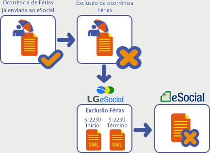 Uma ocorrência de Férias já enviada ao eSocial, teve que ser cancelada e removida do sistema. No módulo eSocial, foi gerado um processamento de Exclusão enviando dois arquivos S-2230 - Afastamento Temporário, um de exclusão de início das férias e o outro de exclusão do término: