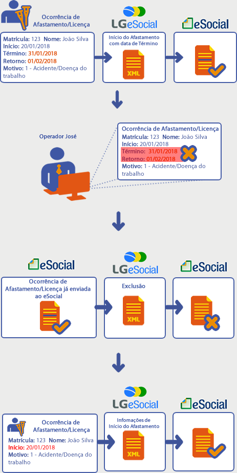 No dia 20/01/2018 foi cadastrada uma ocorrência de afastamento para o colaborador João Silva com Início em 20/01/2018 e Término em 31/01/2018. No dia 27/01/2018 essas informações foram enviadas e aceitas pelo ambiente nacional do eSocial.