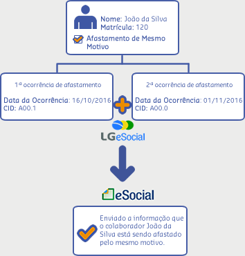 Supondo que o colaborador João Silva tenha um afastamento com data inicial em 01/11/2016 com CID A00.0 e outro afastamento anterior com data em 16/10/2016 com a CID A00.1, , considerando que a opção Afastamento de Mesmo Motivo tenha sido selecionada.