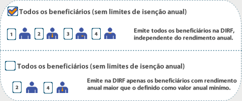 Todos os beneficiários com rendimentos (tributáveis e/ou isentos) - Habilitado apenas quando o Ano-Calendário informado for 2010 ou posterior, permite ao operador determinar se deseja emitir todos os beneficiários no arquivo da DIRF, independente de eles terem atingido valores iguais ou superiores aos informados como limite de isenção anual estabelecido na funcionalidade DIRF – Informações Adicionais, guia Valor Anual Mínimo de Rendimentos, ou ainda se tiverem retenção de imposto de renda em pelo menos um mês dentro do ano-calendário informado.