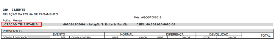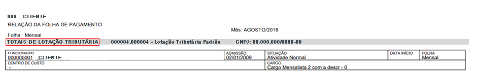Ao selecionar a opção Folha ou Resumo Lotação Tributária na seção Emitir juntamente com o indicador Emitir valor proporcional por lotação tributária o relatório será apresentado, conforme imagem abaixo: