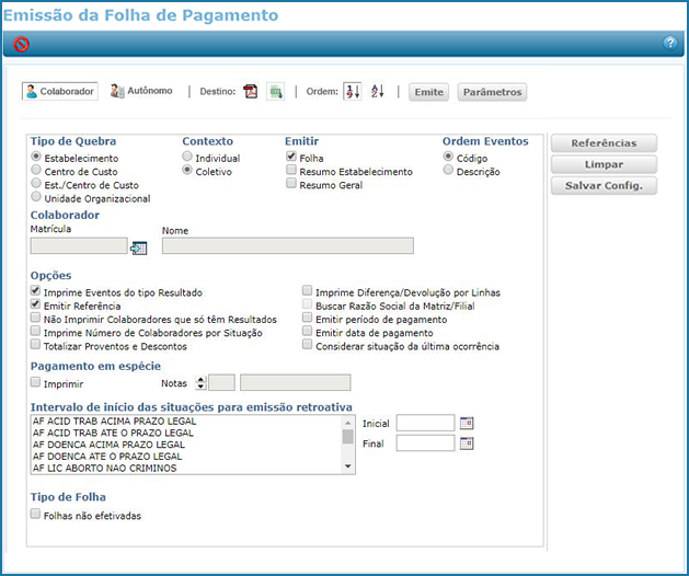É possível realizar a emissão da folha de pagamento para o Contexto Coletivo ou Individual.