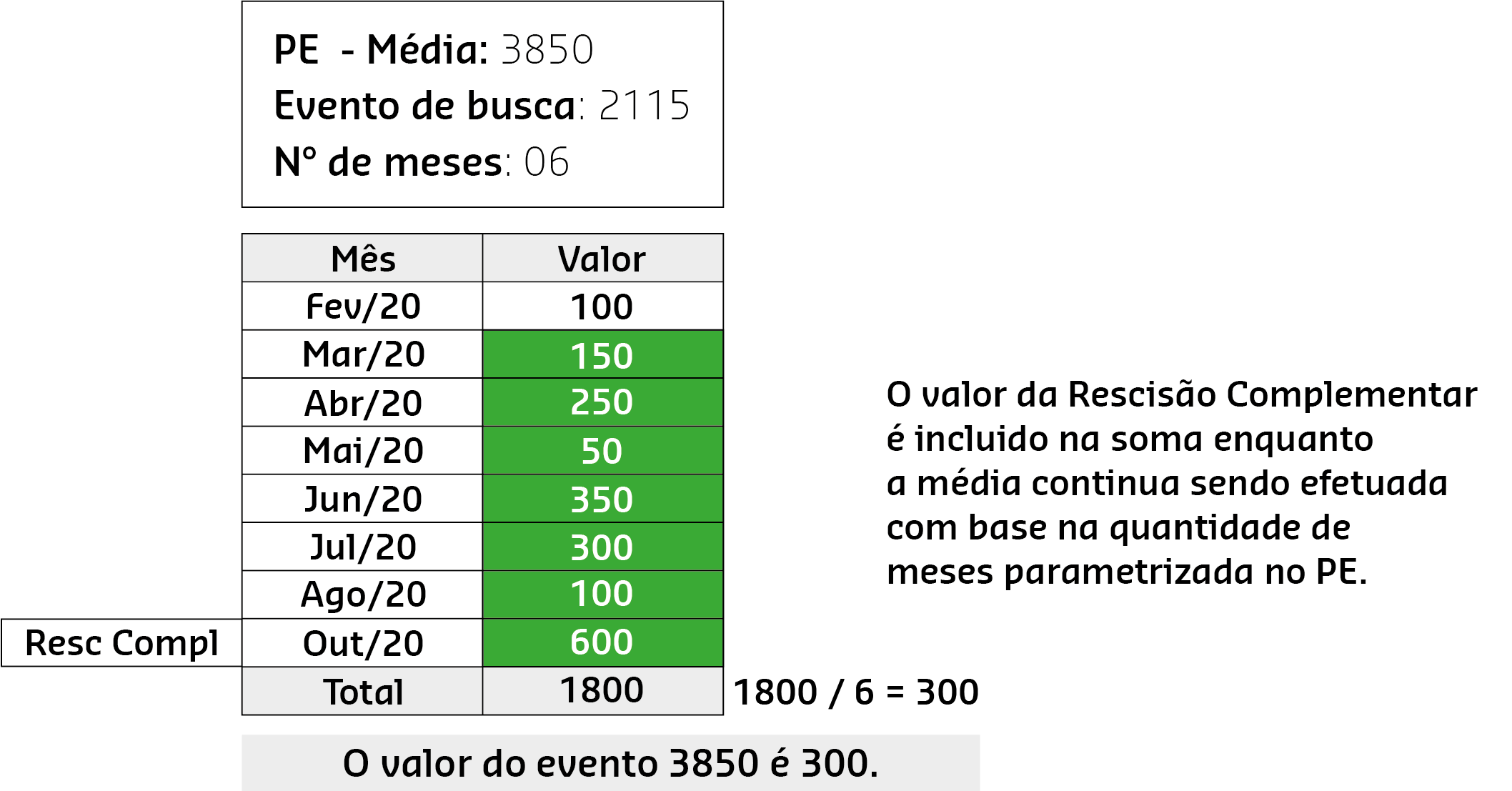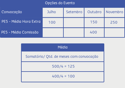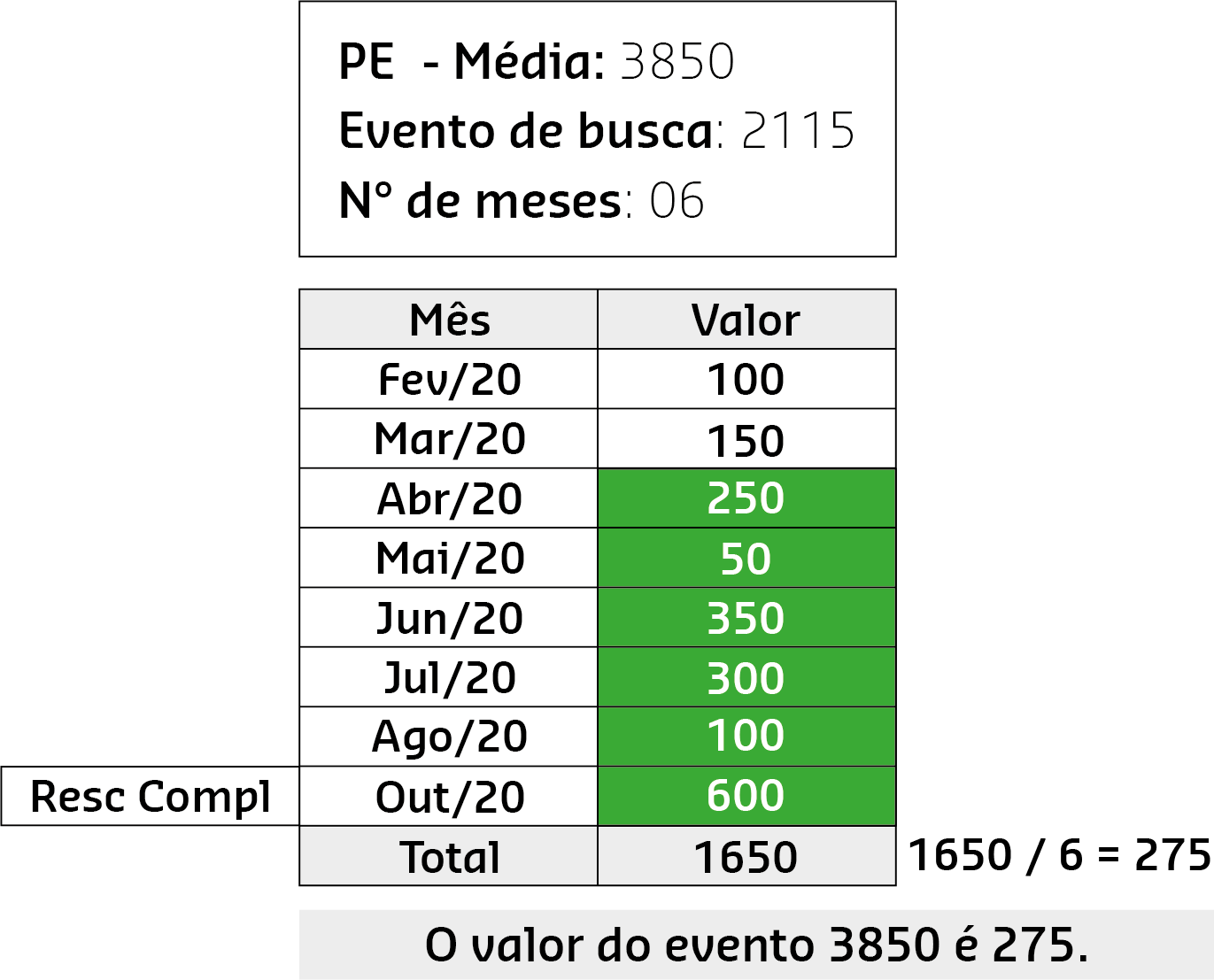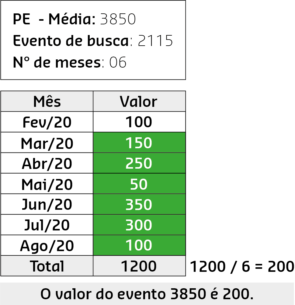 Desta forma, o PE buscará os valores do evento indicado dos meses 03/2020 - 04/2020 - 05/2020 - 06/2020 - 07/2020 e 08/2020 e dividirá por 6, conforme demonstrado abaixo: