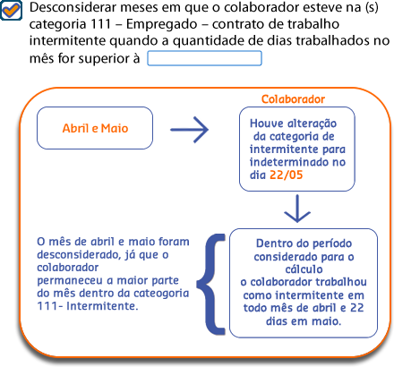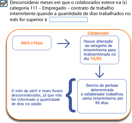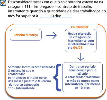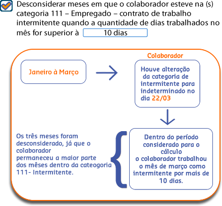 Marque a opção Desconsiderar mês em que o colaborador esteve na categoria 111 - Empregado - contrato de trabalho intermitente com quantidade de dias superior à X Dias para que o sistema desconsidere do cálculo, os meses em que o colaborador esteve na Categoria 111 – Empregado – contrato de trabalho intermitente com a quantidade de dias superior à informada.