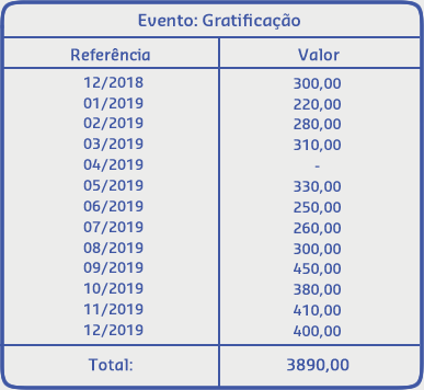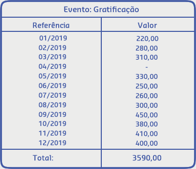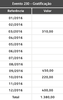 No intervalo janeiro a dezembro, o evento 00230 – Gratificação foi gerado apenas nas folhas de março, setembro, outubro e dezembro. Neste cenário, o cálculo da média deve somar os eventos e dividir por 4, somente a quantidade de meses em que o evento foi calculado.