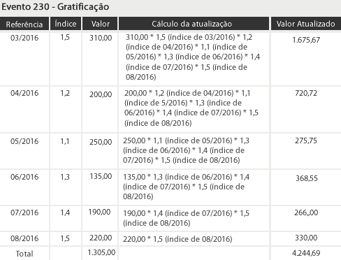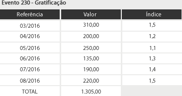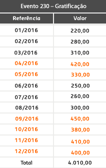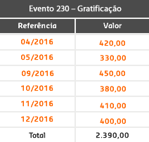 Considerando o evento 230 – Gratificação calculado na folha de pagamento mensal conforme abaixo: