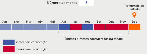 Maiores valores = 6.O cálculo da média buscará os 6 maiores valores dentro do intervalo de 12 meses, fazendo a média aritmética (6 valores por 6 meses). Veja:
