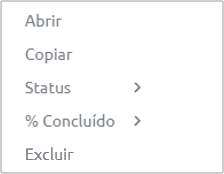 % Concluído - Ao selecionar essa função, serão listados os possíveis percentuais variando de 0 à 100, de 10 em 10%. Esse campo é alterada manualmente pelo usuário.