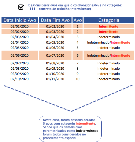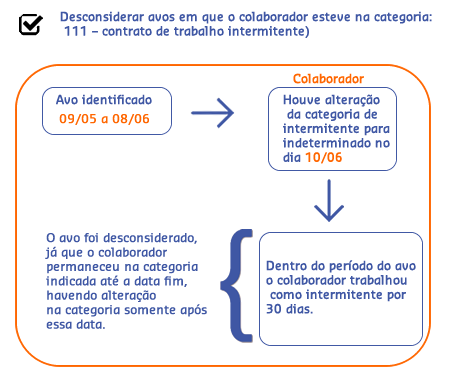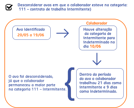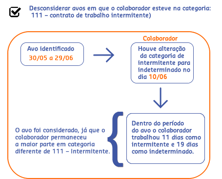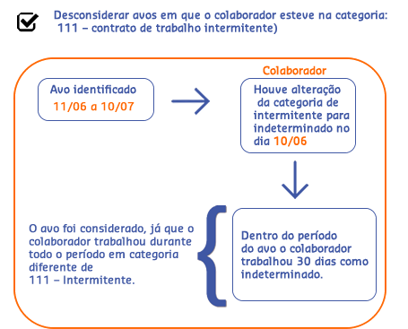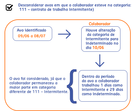 Desconsiderar avos em que o colaborador esteve na categoria: 111 – contrato de trabalho intermitente - será realizada uma análise avo a avo para saber se esse será ou não considerado no cálculo. O avo é adquirido quando o colaborador trabalha 15 ou mais dias dentro do período.
