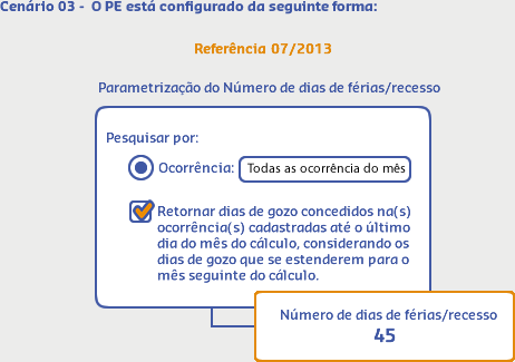 Os dias de gozo podem estar contidos até o último dia do mês de referência do cálculo ou ir além deste mês. O número de dias de gozo desejado pode considerar apenas os dias contidos ou não até o último dia do mês de referência, essa configuração é feita através da opção Retornar dias de gozo concedidos na(s) ocorrência(s) cadastrada(s) até o último dia do mês do cálculo, considerando os dias de gozo que se estenderem para o mês seguinte do cálculo.