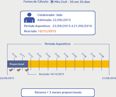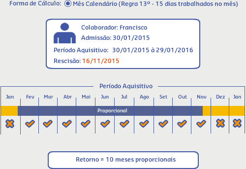 Nesse caso, temos como resultado 10 meses proporcionais, pois o colaborador trabalhou mais de 15 dias no mês da rescisão e menos de 15 dias no mês da admissão.