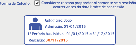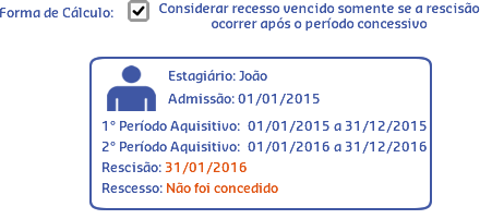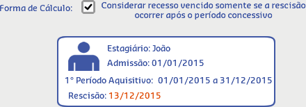 Neste cenário, de acordo com os dados do estagiário João, sua rescisão ocorreu fora do período de concessão e seu recesso não foi concedido, por isso o resultado do cálculo do Número de períodos aquisitivos de férias/recesso vencidos foi igual a 1.