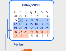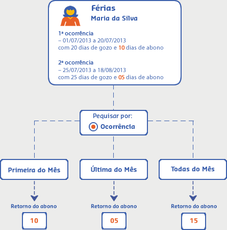 - Primeira ocorrência do mês - quantidade de dias de abono da primeira ocorrência. Se não houver ocorrência, então a quantidade é zero.