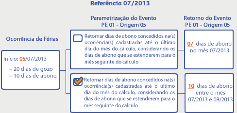 Os dias de abono podem estar contidos no mês de referência do cálculo ou ir além deste mês. O número de dias de abono desejado pode considerar apenas os dias contidos ou não no mês de referência, essa configuração é feita através da opção Retornar dias de abono concedidos na(s) ocorrência(s) cadastradas até o último dia do mês do cálculo, considerando os dias de abono que se estenderem para o mês seguinte do cálculo. Caso essa opção seja selecionada será retornado o total de dias de abono independente se os mesmos estenderam para o mês seguinte do cálculo ou não.