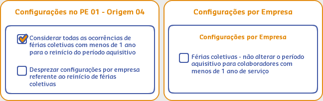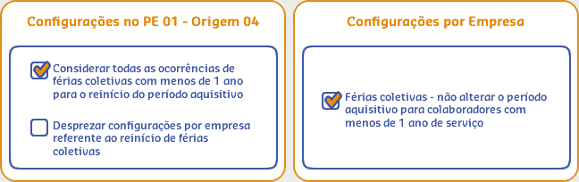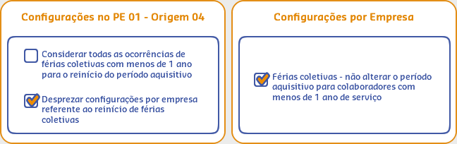 Neste cenário nas configurações do Procedimento Especial somente a opção Considerar todas as ocorrências de férias coletivas com menos de 1 ano para o reinício do período aquisitivo esta marcada, enquanto nas Configurações por empresa a opção Férias coletivas - não alterar o período aquisitivo para colaboradores com menos de 1 ano de serviço está desmarcada, por isso, para este cenário será considerado todos os reinícios de férias do colaborador no Período Aquisitivo.