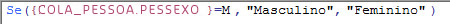 A composição da fórmula para verificação do sexo do colaborador, fica conforme a imagem acima. Onde {FUNCIONA.FUDESCSEXFUN} é um valor do tipo Campo do Relatório que mostra o sexo do colaborador. Quando o funcionário for do sexo masculino será retornado o valor verdadeiro da expressão que é igual a Masculino, caso contrário será retornado o valor falso da expressão que é Feminino.