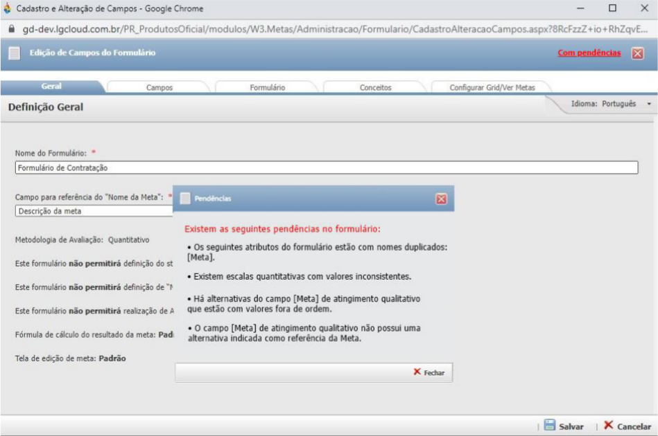 Caso haja pendências no formulário cadastrado, ao editá-lo, é possível visualizar a mensagem com o detalhamento da pendência.