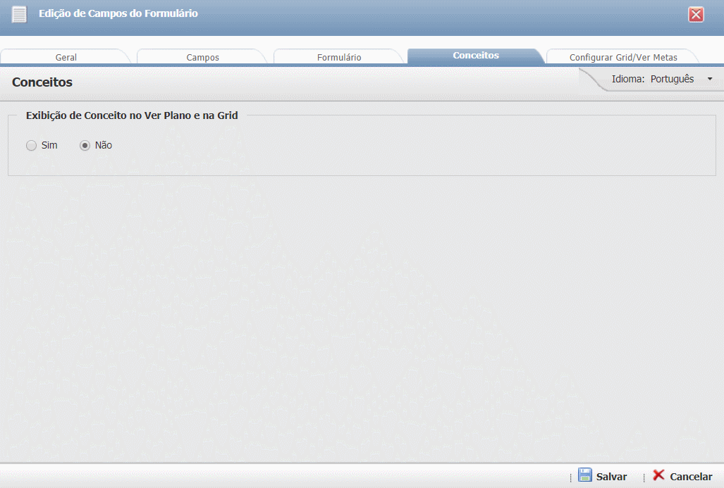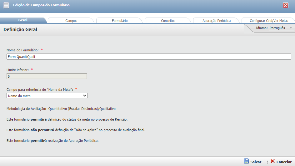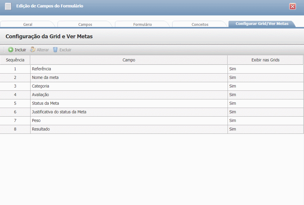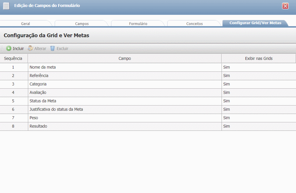 Finalizando a configuração da inclusão do Formulário, clique em    , e fazendo isto, surgirá uma janela contendo as guias Geral, Campos, Formulário, Conceitos e Configurar Grid / Ver metas, para que sejam feitas edições nos campos dos formulários.