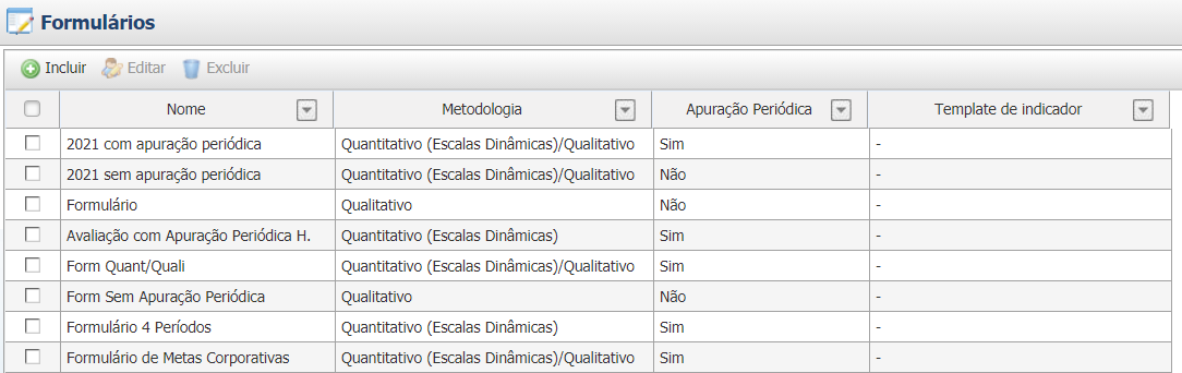 Através de Formulários é possível definir as regras que norteiam o ciclo avaliativo das metas e objetivos das empresas. É nesta função que os Administradores escolhem se um determinado Ciclo terá Apuração Periódica de resultados e qual metodologia será utilizada (Qualitativo, Quantitativo, Quantitativo (Escalas Dinâmicas) ou Quantitativo (Escalas Dinâmicas) / Qualitativo).